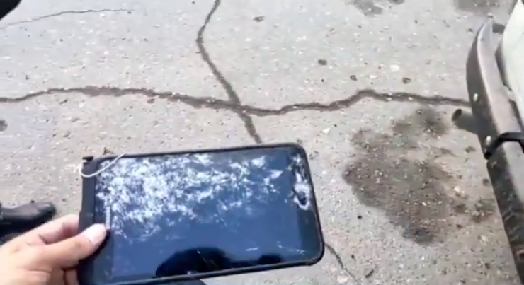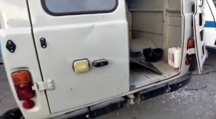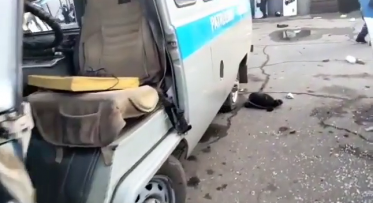 На кадрах, запечатленных очевидцами, видны три автомашины сотрудников полиции с разбитыми стеклами.