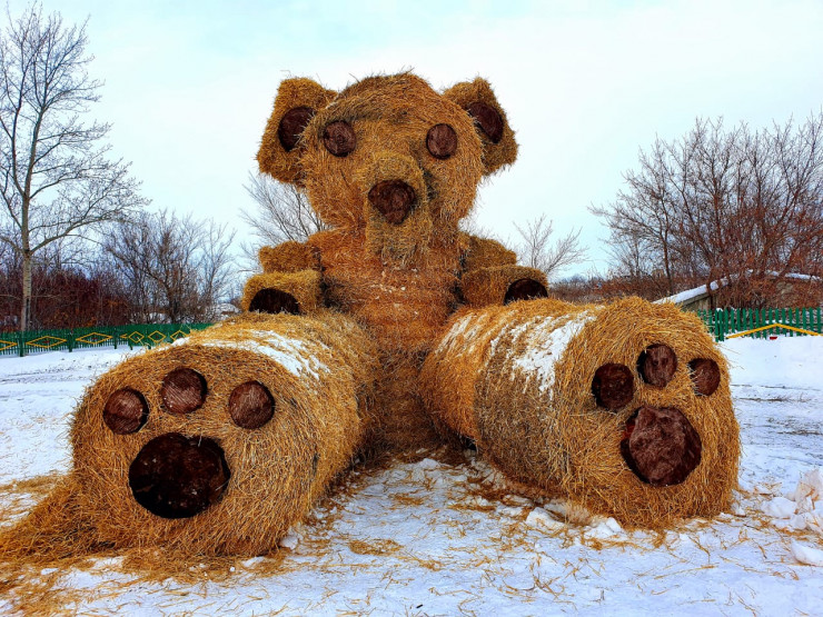 До того как построить эту необычную композицию из тюкованной соломы, предприниматель провел уличное освещение по всему поселку. Владимир Журжа говорит, что и внуков своих приучает к труду и прекрасному. Все делают вместе, в селе живут три его сына и восемь внуков.