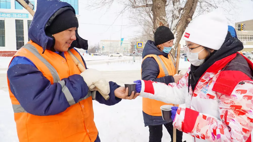 "Сегодня, несмотря на непогоду, волонтеры вышли поддержать акцию "30 добрых дел" и помогли жителям и гостям столицы, работникам ТОО "Астана тазалық", которые делают наш город чище, согреться горячим чаем, а также угостили не менее горячими баурсаками. Таким образом волонтеры подарили бодрость, хорошее настроение и просто согрели своим вниманием в этот морозный день. Всего было роздано 50 литров чая и 7 килограммов баурсаков", – сообщили в МРЦ "Астана жастары".