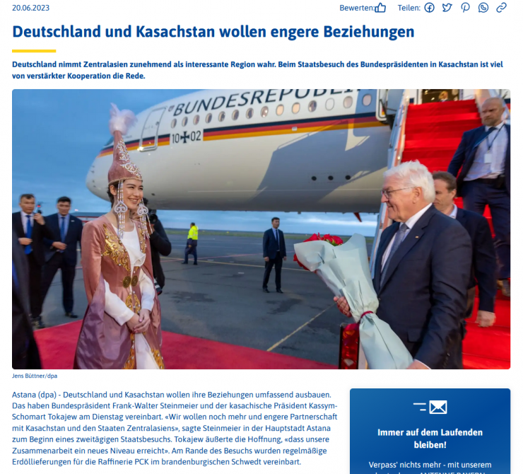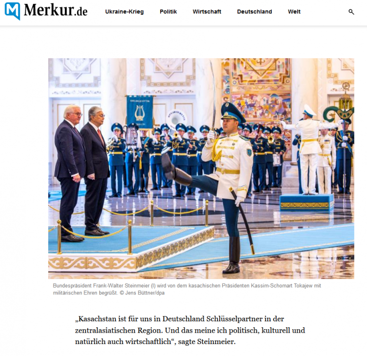 Также Die Welt привела цитату Штайнмайера по поводу решения Казахстана увеличить поставки нефти на НПЗ в Шведт на 10 процентов: "Это хорошая новость для Шведта и хорошая новость для энергетической безопасности Германии".