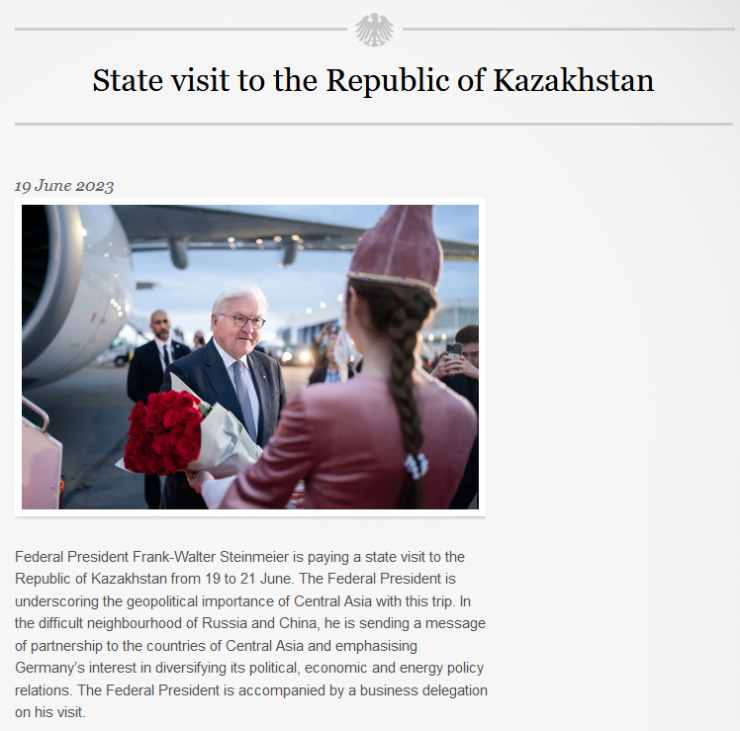 "По данным ведомства федерального президента, Штайнмайер намерен использовать этот визит, чтобы подчеркнуть огромное геополитическое и геоэкономическое значение региона, которое еще больше возросло после начала войны в Украине. Послание звучит так: "Германия и Европа готовы стать партнерами государств Центральной Азии. Вы не одиноки в Вашем сложном соседстве с Россией и Китаем", - пишет Die Welt.