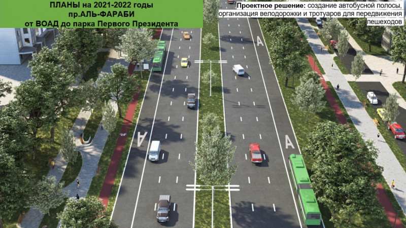 Так, горожанам в онлайн-формате были презентованы планы по созданию пешеходных пространств. На сегодня в городе имеется 110 прогулочных пешеходных зон общей протяженностью 54 километра. Руководство города планирует дальше развивать создание новых общественных пространств как в центральной части, так и в периферийных районах, эффективно использовав рекреационный потенциал города. К примеру, проект преобразования территории вдоль автомобильных дорог от международного аэропорта до парка Первого Президента протяженностью 25 километров по следующим основным улицам: Майлина – Бухтарминская – Кульджинский тракт – ВОАД – Аль-Фараби.