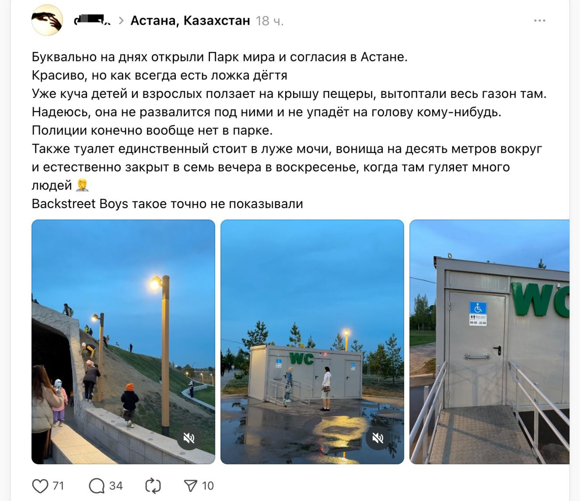 Появившиеся посты в соцсети прокомментировали в акимате Астаны, отмечая, что Парк Мира и Согласия открылся пару дней назад и уже стал популярным местом горожан и гостей столицы.