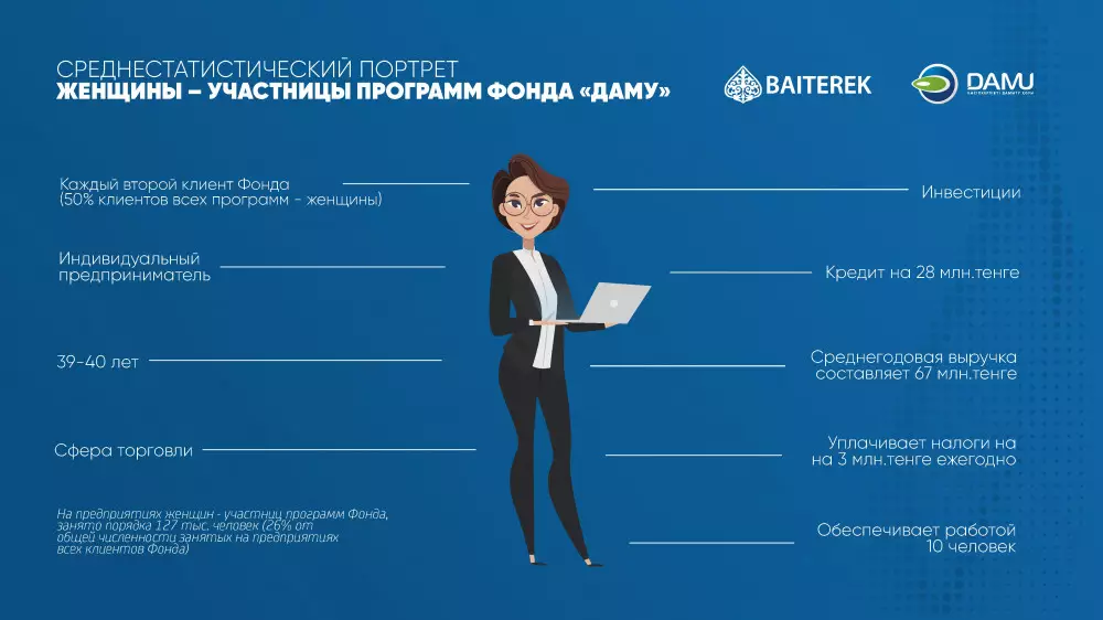 "Из всех проектов, поддержанных Фондом "Даму", более 51 процента приходятся на женское предпринимательство. Их общая сумма составила 1,26 триллиона тенге. Надеемся, что опыт успешных предпринимательниц вдохновит еще больше женщин заняться собственным делом жизни. А государственные институты, призванные поддержать деловые инициативы, им помогут", - считает председатель правления АО "Фонд развития предпринимательства "Даму" Гаухар Бурибаева.