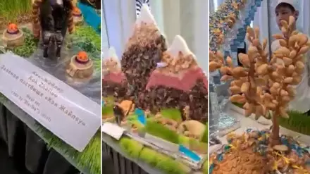 "День независимости Казахстана в Кыргызстане. Посольство казахское организовывает. Это горы Алатау, сделанные из казы-карта. Вот дерево из баурсаков, ничего себе, оригинально. Вот 30 лет пик Нурсултана. Горы из чак-чака сладкие. Искусство какое. Молодцы", - говорит голос за кадром.