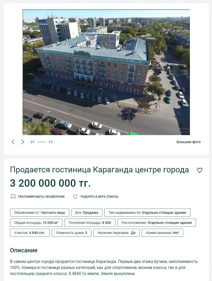 Объявление о продаже знаменитой гостиницы было опубликовано на сайте OLX. Согласно указанным данным, пятиэтажная гостиница "Караганды", расположенная в центре Караганды на пересечении проспектов Бухар-Жырау и Нуркена Абдирова, выставлена на продажу за 3,2 миллиарда тенге.