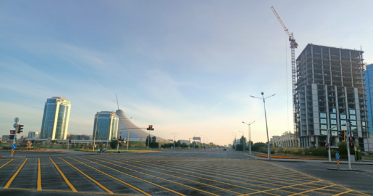 На перекрестке проспектов Туран и Сыганак нанесены линии дорожной разметки желтого цвета в виде диагонали.