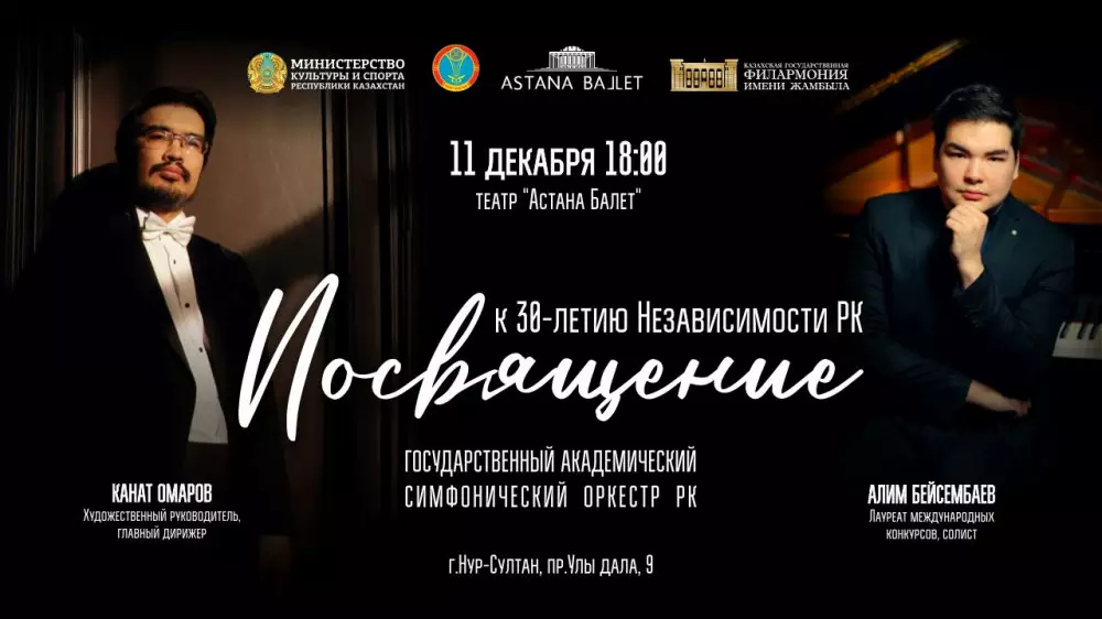Министерство культуры и спорта РК при поддержке акимата города Нур-Султана совместно с театром "Астана Балет" представляет проект Казахской государственной филармонии имени Жамбыла – концерт симфонической музыки "Посвящение" к 30-летию независимости Республики Казахстан.