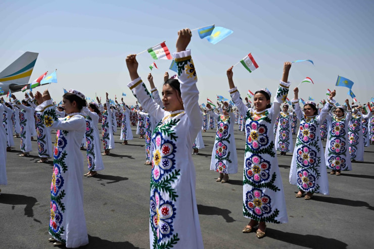 На большом экране, установленном на территории аэропорта, можно увидеть фотографии президентов Казахстана и Таджикистана.