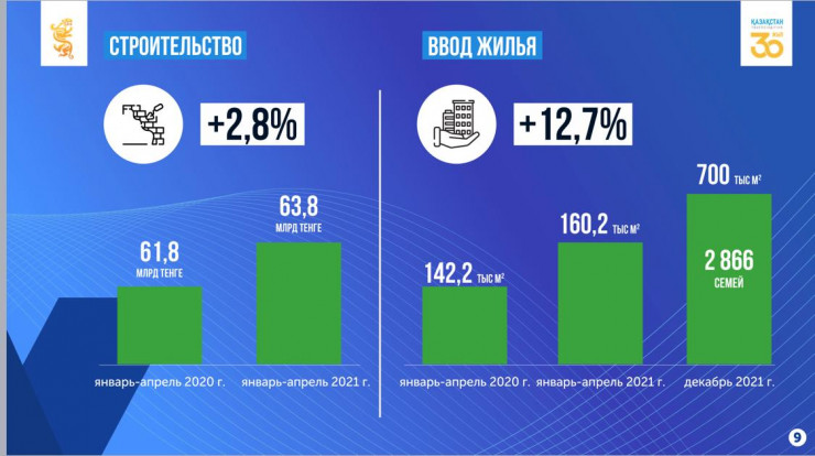 "К декабрю планируем ввести около 700 тысяч квадратных метров жилья. Это на четверть больше, чем в прошлом году. А на ближайшую трехлетку поставили задачу выйти на показатель в один миллион квадратных метров в год, – сообщил аким области. – До конца этого года бюджетным жильем планируем обеспечить 2 866 семей из числа очередников. Из них 600 – многодетные семьи".