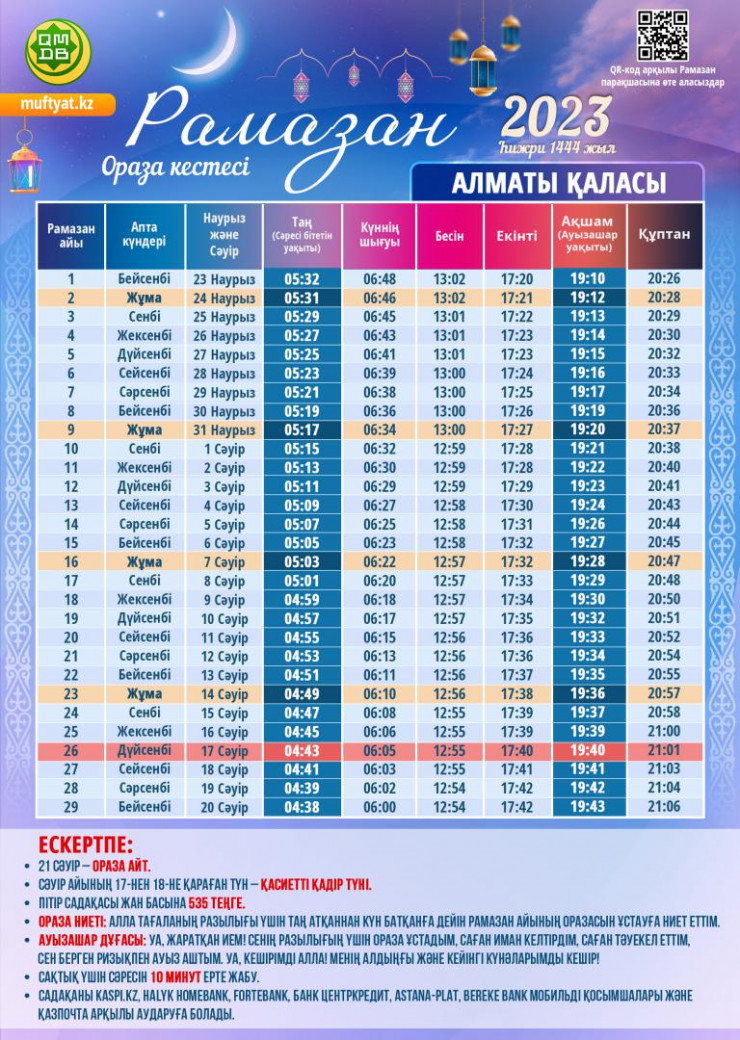 Ниже - официальное расписание Оразы по городам Казахстана.