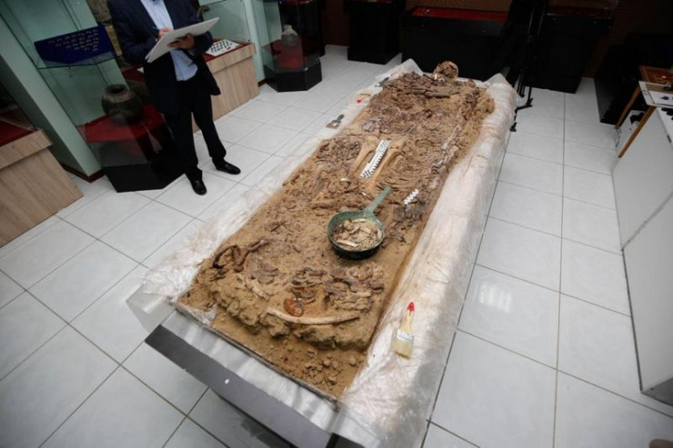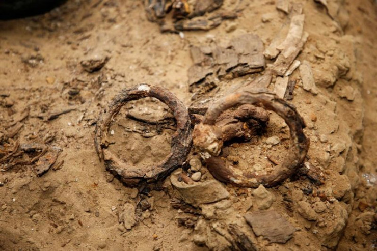 Останки были обнаружены при археологических раскопках на трех курганах, расположенных в селе Миялы Кызылкогинского района. По мнению экспертов, останки в железном облачении принадлежали мужчине ростом 175 сантиметров.