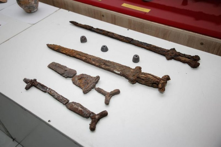 Рядом с останками также был найден меч длиной в один метр, наконечники стрел и щит, патера, конное снаряжение и многие другие артефакты.