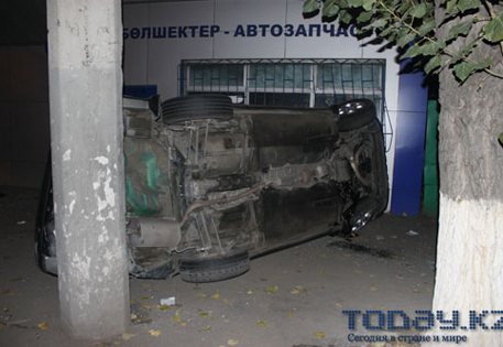 Двигаясь на юг по улице Утеген батыра, водитель автомашины Subaru Outback попытался совершить разворот, не справился с управлением, в результате чего, перелетев через бордюр, на полном ходу врезался в магазин. От сильного удара автомобиль опрокинуло. Машиуну протащило несколько метров, после чего она застряла между столбом и магазином. Судя по внешним признакам, водитель находился в состоянии алкогольного опьянения.