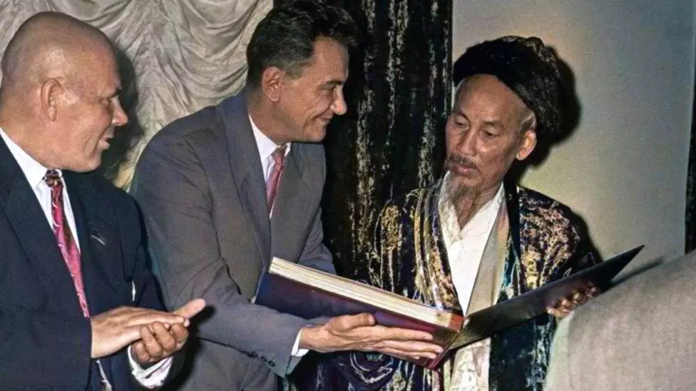 Пресс-секретарь Президента Казахстана опубликовал архивное фото со встречи Динмухамеда Кунаева и Каныша Сатпаева с национальным лидером Вьетнама Хо Ши Мином в Алматы.