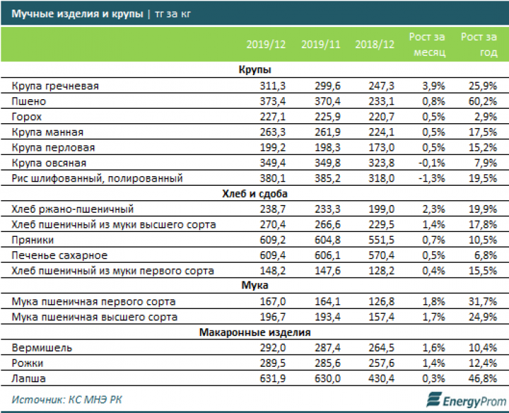 Среди мучных изделий и круп сильнее всего подорожали гречневая крупа (сразу +3,9 процента к ноябрю), ржано-пшеничный хлеб (+2,3 процента), пшеничная мука первого (+1,8 процента) и высшего (+1,7 процента) сорта и вермишель (+1,6 процента за месяц).