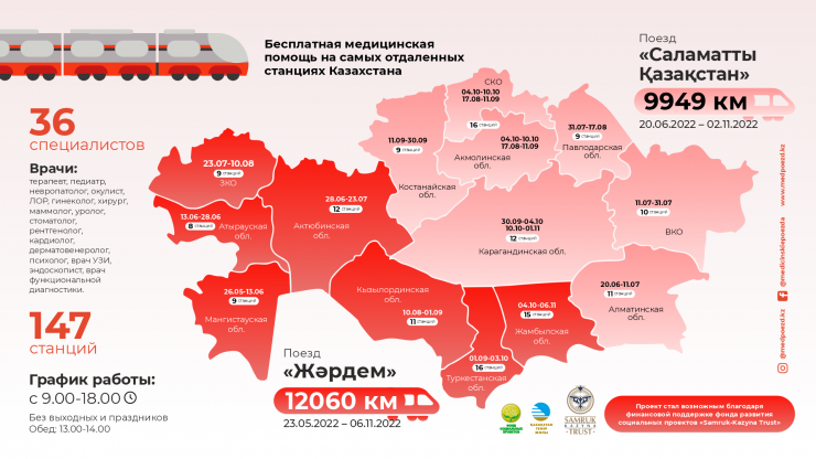 Медпоезд "Жардем" с 23 мая по 6 ноября посетит 80 станций, а "Саламатты Қазақстан" с 20 июня по 2 ноября – 67 станций. В целом ожидается, что медпоезда охватят 60 000 человек, число врачебных посещений к специалистам составит 100 000, диагностических процедур – 18 000, малых хирургических операций – 1 200, а стоматологическая помощь будет оказана 8 000 пациентов. Поезда посетят весь Казахстан: "Жардем" – Кызылординскую, Западно-Казахстанскую, Актюбинскую, Атыраускую, Мангистаускую, Туркестанскую, Жамбылскую области; "Саламатты Қазақстан" – Алматинскую, Восточно-Казахстанскую, Павлодарскую, Северо-Казахстанскую и Акмолинскую, Костанайскую, Карагандинскую области.