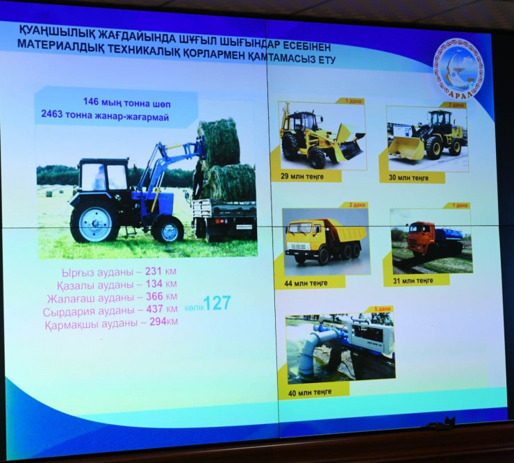 "В текущем году в Аральском районе произошла засуха, которая привела к падежу 559 голов скота. В связи с засушливой ситуацией в Кызылординской и Мангистауской областях Президент страны Касым-Жомарт Токаев поручил правительству принять необходимые меры. В первую очередь для сохранения поголовья скота необходимо рыть водные скважины, очищать каналы и сооружать плотины для обводнения пастбищных и сенокосных угодий. Для полной реализации этих проектов должны быть проведены работы по обводнению озерной системы Акшатау-Камбаш с перекрытием канала Бурмакулак от реки Сырдарьи и вводом в эксплуатацию водовода Аспай. В связи с требующимися большими объемами финансирования вышеуказанных работ направлено письмо в правительство о выделении средств из республиканского бюджета", - сказала Гульшара Абдыкаликова.