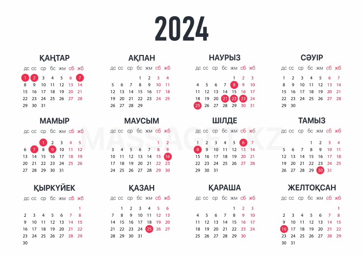Сәуірде мемлекеттік мерекелер атап өтілмейді. Сондықтан бұл айда тек сенбі-жексенбі күндері ғана демалыс.