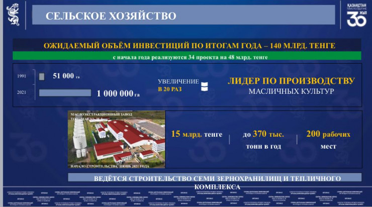 Идет строительство самого мощного завода по переработке масличных культур на 370 тысяч тонн. В проект будет вложено 15 миллиардов тенге инвестиций c созданием 200 рабочих мест. Запустят 7 зернохранилищ, завод по производству семян и тепличный комплекс.