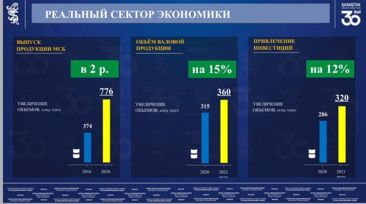 Выпуск продукции малого и среднего бизнеса за 5 лет вырос в 2 раза, с 374 до 776 миллиардов тенге. По итогам года ожидается объем производства в промышленности на сумму в 360 миллиардов тенге, за год плюс 45 миллиардов тенге. Рост объема инвестиций составит 12 процентов, с 286 до 320 миллиардов тенге.