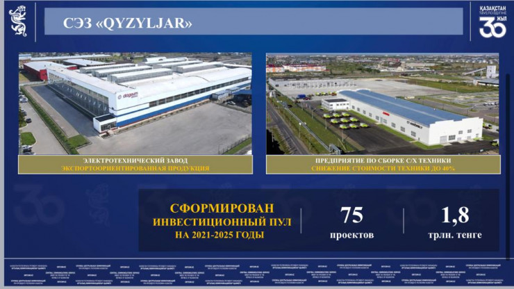 На территории специальной экономической зоны "Кызылжар" реализуются перспективные инвестпроекты, такие как электротехнический завод и предприятие по сборке сельскохозяйственной техники CLAAS. Ожидается включение еще одного проекта по производству бумажных изделий.