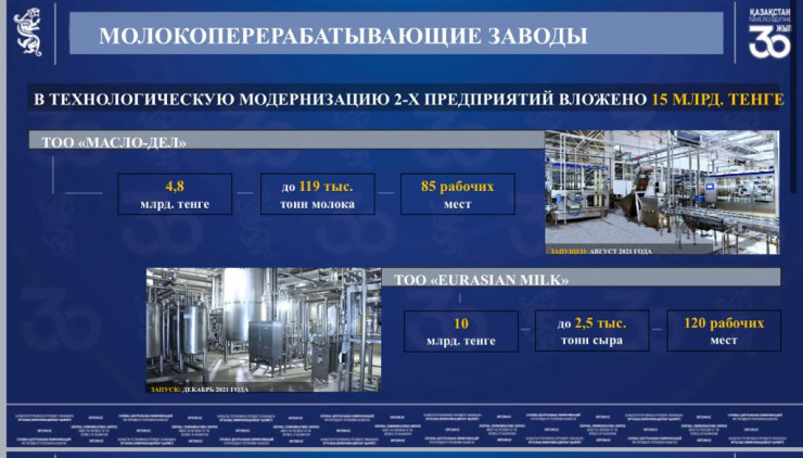 Половина из 29 молочных комплексов, строящихся по стране, приходится на долю СКО. В регионе строят 16 молочных ферм, из них 10 запустят до конца года. Два молочных завода направили 15 миллиардов тенге на модернизацию и запуск современных линий по выпуску молочной и сырной продукции. Строятся две откормочные площадки мясного направления и 2 птицефабрики. В целом объем инвестиций в сельское хозяйство в этом году достигнет 140 миллиардов тенге. Это четверть всего объема по стране.