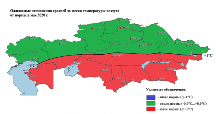 В мае температура воздуха в северной половине Казахстана ожидается около климатической нормы, в южной половине - выше нормы на 1 градус, передает корреспондент Tengrinews.kz со ссылкой на РГП "Казгидромет".