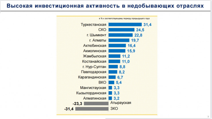 Всего в область привлечено 156 миллиардов тенге инвестиций с ростом в 124,5 процента, частные инвестиции составили 135,3 миллиарда тенге с ростом в 142,3 процента.