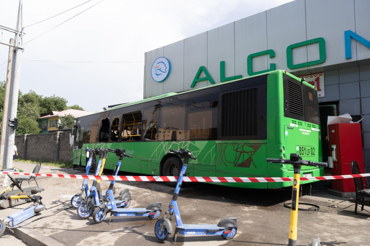 Появились фото с места ДТП с автобусом в Алматы, передает корреспондент Tengrinews.kz. Судя по кадрам, автобус съехал с проезжей части и врезался в будку возле "алкомаркета"