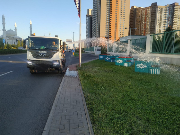 "В связи с неблагоприятными погодными условиями – температура доходит до 36 и выше градусов – было принято решение об усиленной промывке улично-дорожной сети", — сказал официальный представитель ТОО "Астана-Зеленстрой" Рустем Нурсагитов.