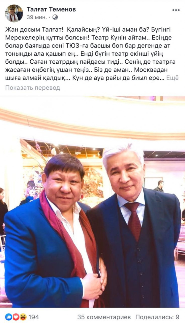 "Дорогой мой друг Талгат! Как твои дела? Поздравляю тебя с праздником! Я про день театра. Помнишь, когда-то я тебе говорил стать начальником ТЮЗа, ты не соглашался. А теперь театр - твой второй дом. Театр пошел тебе на пользу. Да и ты немало сделал для театра. У нас тоже все хорошо. Не смогли покинуть Москву. И день, и погода особенные сейчас. В прошлый раз ты говорил, что ребята интересовались. Передай им привет. Я не сижу дома без дела. Вы из меня тоже сделали творческого человека. Самое главное, чтобы сейчас нам всем пройти этот период с вирусом. Я соскучился по вам. До скорой встречи, мой друг! С уважением, Имангали", - говорится в письме. (примерный перевод. - Прим.).