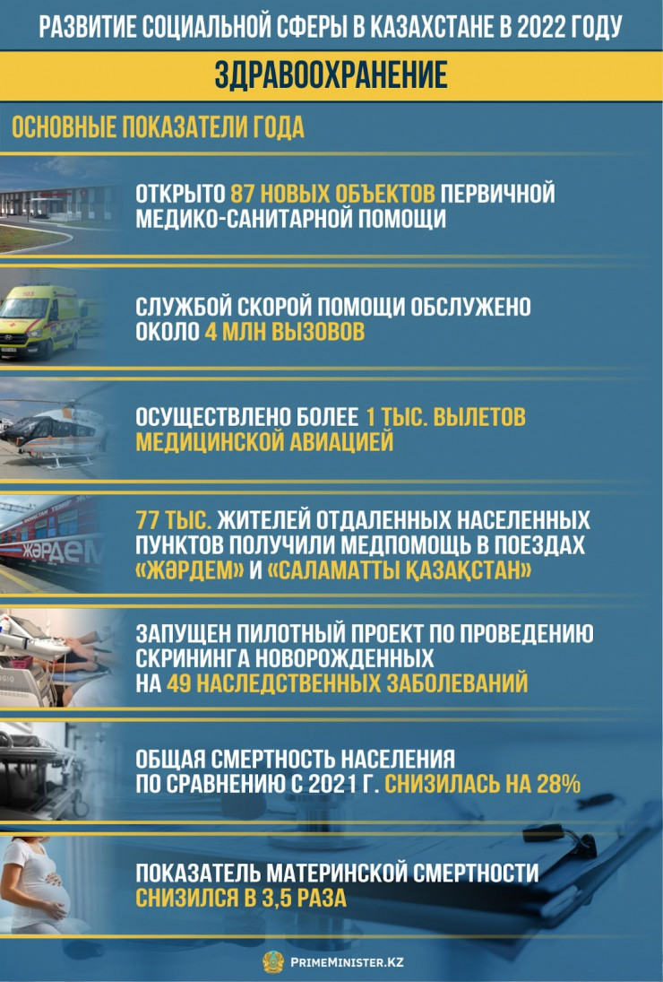 Вместе с тем были внедрены профилактические осмотры для сельских жителей, запущен пилотный проект по проведению скрининга новорожденных на 49 наследственных заболеваний, расширены пакеты профосмотров детского населения и возобновлена работа медпоездов "Жәрдем" и "Саламатты Қазақстан", которые посетили 147 станций и оказали медицинскую помощь более 77 тысячам жителей отдаленных населенных пунктов.