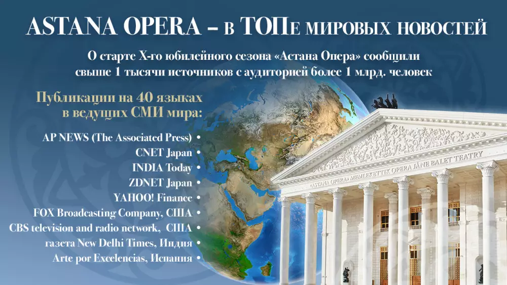 Тысячи рейтинговых СМИ на 40 языках мира распространили новость о десятом юбилейном сезоне "Астана Опера". Это важное событие в жизни Казахстана активно обсуждали массмедиа США, Канады, Японии, Китая, Кореи, Италии, Испании, Индии, Германии, Австралии, Бразилии и многих других стран.