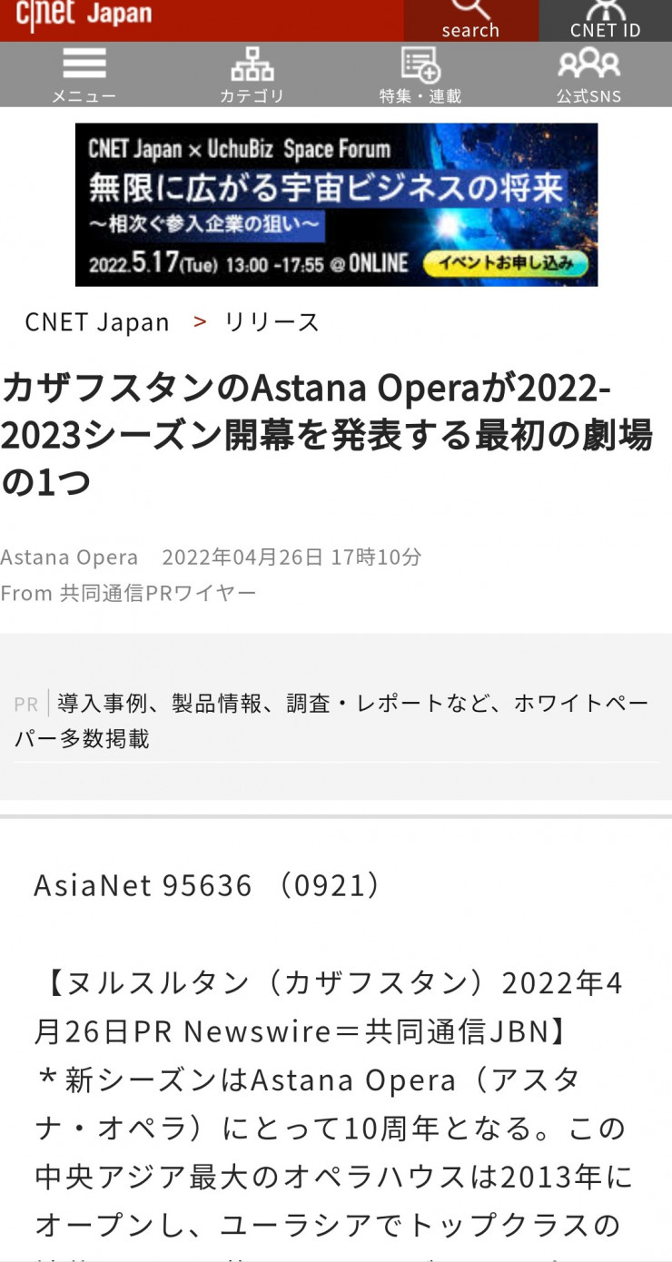 Популярный новостной сайт Японии CNET с 88-миллионной аудиторией процитировал слова директора театра Галыма Ахмедьярова: "Гала-опера пройдет с участием известной корейской оперной певицы, лауреата премии "Грэмми" Суми Чо, а также коллектив представит ряд значимых премьер. Мы приготовили вниманию публики новую современную постановку балета "Золушка" немецкого хореографа Раймондо Ребека на музыку Прокофьева. В начале сезона также ожидается премьера национальной оперы "Калкаман и Мамыр" Балнур Кадырбек. Кроме того, афишу украсит недавно пополнивший репертуар прекрасный балет Иржи Килиана "Шесть танцев". Все спектакли представлены на высоком уровне и востребованы в Казахстане".