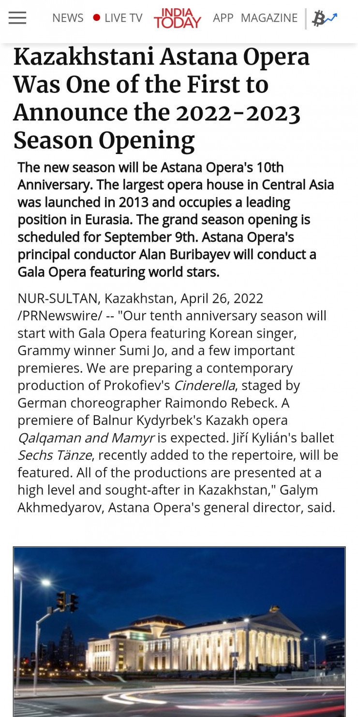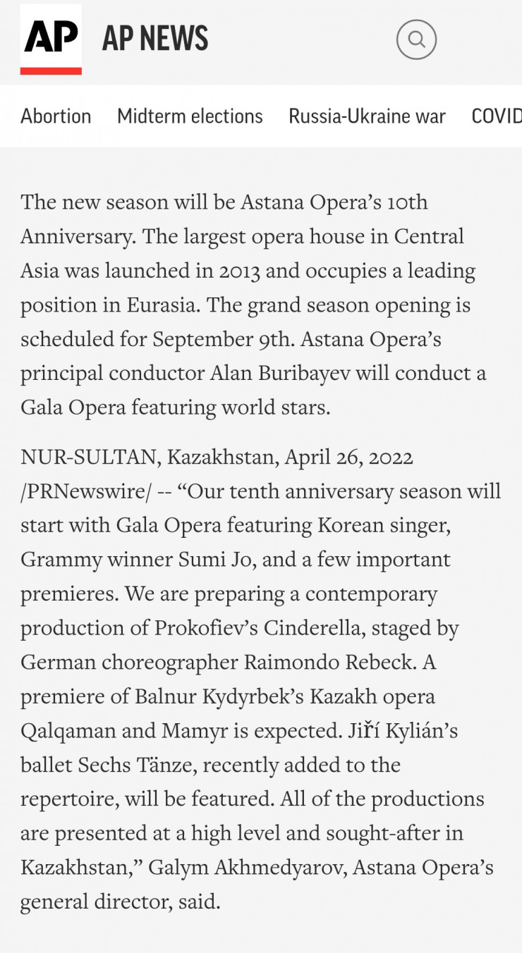 "Ассошиэйтед Пресс" – крупнейшее международное агентство информации - сообщило: "Казахстанский "Астана Опера" одним из первых объявил о старте сезона 2022-2023. Торжественное открытие запланировано на 9 сентября, публике представят Гала-оперу с участием мировых звезд. За дирижерским пультом – знаменитый маэстро, главный дирижер "Астана Опера" Алан Бурибаев", - говорится в статье.