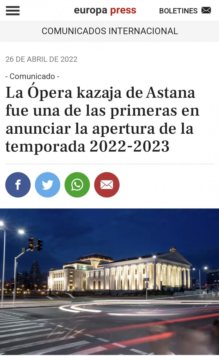 На страницах испанской газеты Europa Press журналисты рассказали, что каждое событие в "Астана Опера" – это отдельная яркая страница в летописи театра, "одна из которых масштабные гастроли – мировое турне по пяти странам: США, Канада, Франция, Бельгия, Голландия. Труппа не раз выступала с гастролями в Италии, Испании, Китае, Омане и других странах. Многим запомнились яркие постановки, осуществленные театром на Международной выставке "ЭКСПО-2017" в Казахстане, в рамках которой в "Астана Опера" прошел ХХV Международный конкурс вокалистов "Опералия" Пласидо Доминго. Впечатлила публику казахстанская премьера Симфонии № 8 Малера в исполнении 1 200 музыкантов. Запись этого концерта транслировалась в этом году на телеканале "Меццо", - подчеркнула испанская газета.
