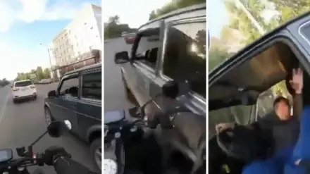 Видео драки между мотоциклистом и водителем "Нивы" на дороге обсуждают пользователи Сети, передает корреспондент Tengrinews.kz.