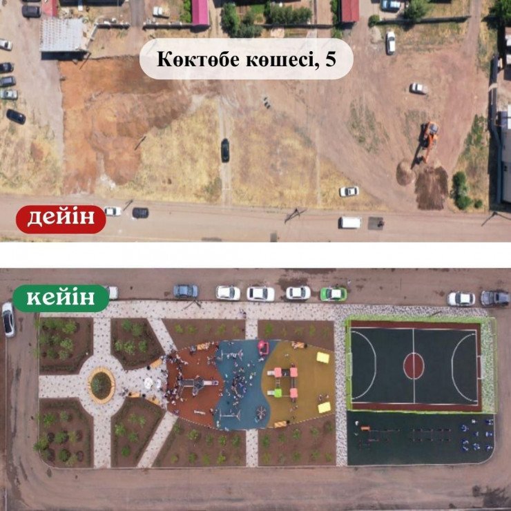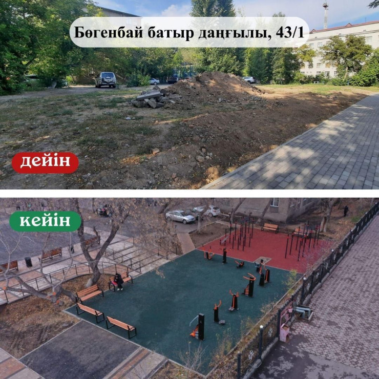 По улице Кумисбекова, 7/1, вместо старых гаражей построили удобное и безопасное место для отдыха горожан. Благоустроили территорию, высадили деревья и др. По адресу переулок Коктобе, 5, вместо пустыря теперь есть спортивно-игровая зона", - написал аким в своем Instagram.