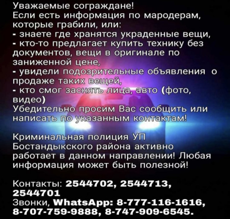 Полицейские Алматы указали номера телефонов, на которые можно выслать фото и видео погромов и массовых беспорядков, передает корреспондент Tengrinews.kz.