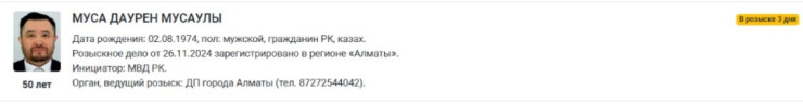 Согласно порталу органов правовой статистики и специальных учетов Генеральной прокуратуры Казахстана, Даурен Муса находится в розыске с 26 ноября.
