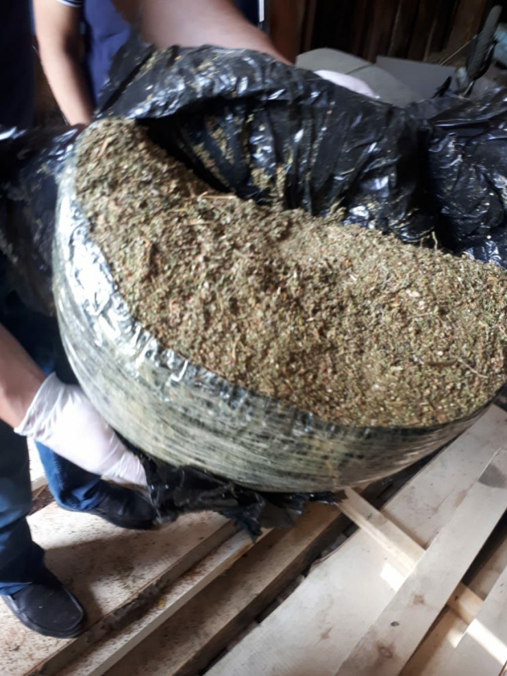 Во время обыска гаража одного из задержанных были обнаружены две клетчатые сумки, в которых находилось несколько пакетов, обмотанных скотчем. В пакетах обнаружили вещество растительного происхождения буро-зеленого цвета со специфическим запахом, экспертиза показала, что данное вещество - высушенная марихуана общим весом более 30 килограммов.