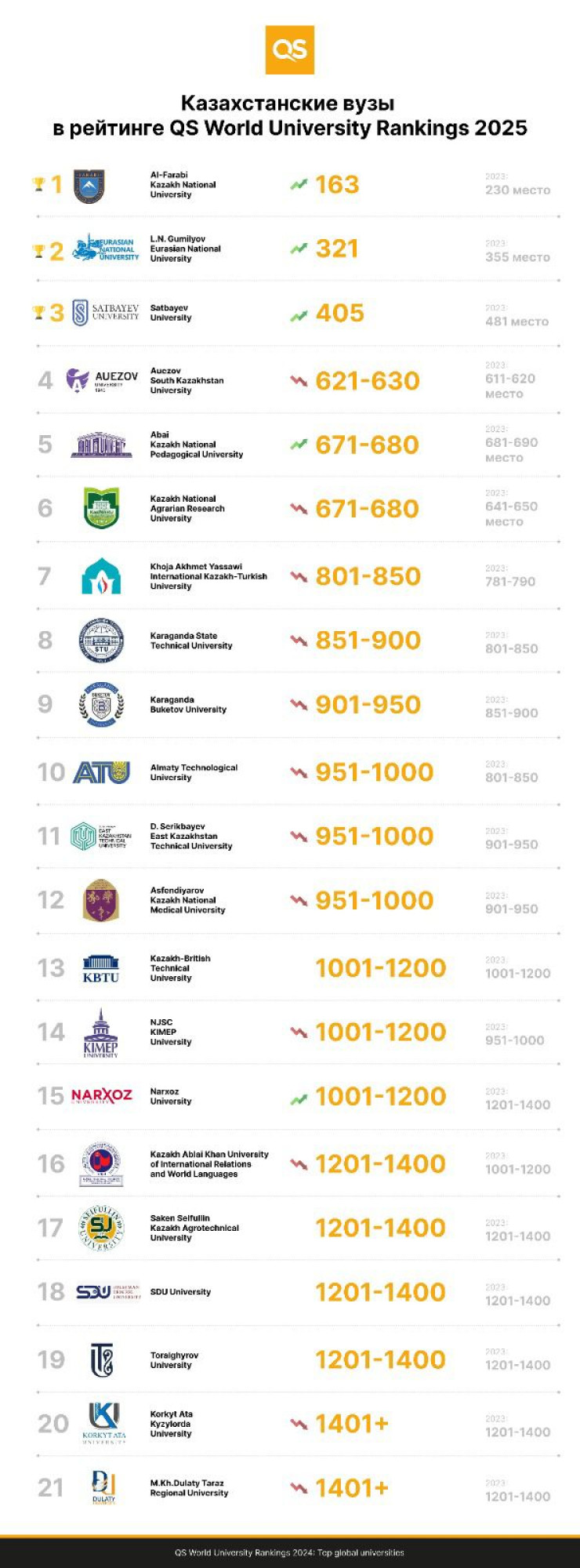 13 университетов Алматы и их позиции в рейтинге QS Asia University Rankings 2025: