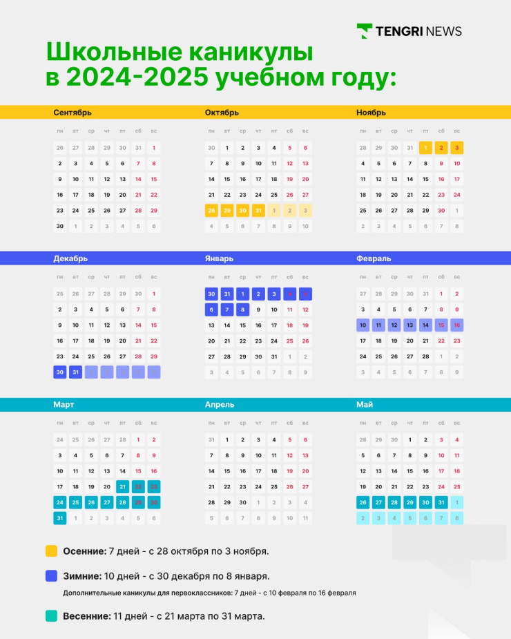 Первая четверть будет длиться восемь учебных недель, осенние каникулы - семь дней, с 28 октября по 3 ноября 2024 года включительно.