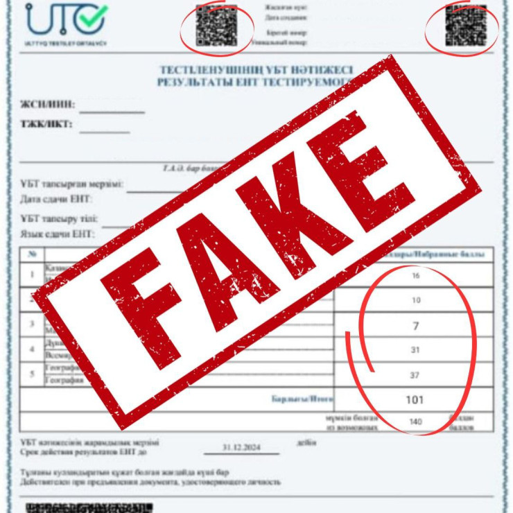 "Кроме того, сертификат ЕНТ является официальным документом, и его подделка влечет за собой уголовную ответственность по статье 385 Уголовного кодекса. Например, в данном сертификате не читается QR-код, а также все цифры написаны разным шрифтом и в разном размере", - отметили в НЦТ, опубликовав фото подделки.
