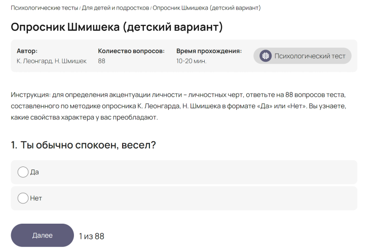 Кроме того, детей попросили пройти детский вариант опросника Шмишека для акцентуации личностных черт.