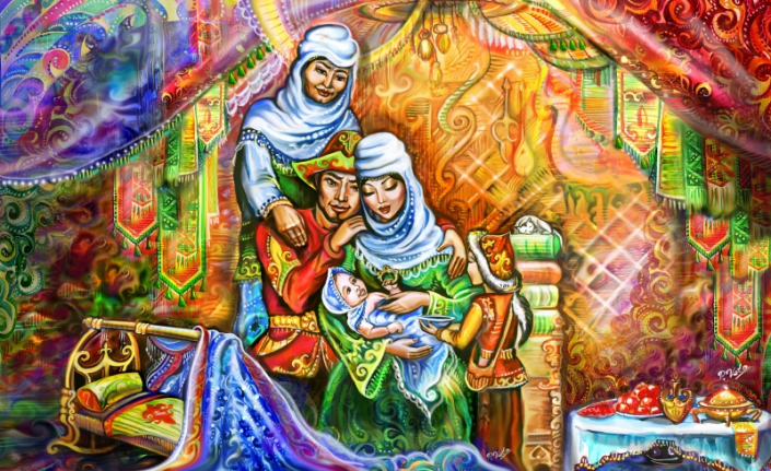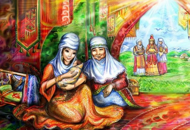 Когда ребенок появлялся на божий свет, его первым делом купали в соленой воде. Пупок мальчика привязывали к гриве коня, а пуповину девочки прятали в тайник. Потом устраивался небольшой ужин. Застолье также имело важное значение. По его итогам шейную часть жертвенной овцы подвешивали на самое высокое место в доме. Это делалось для того, чтобы у ребенка как можно быстрее окрепла шея, и тогда он сможет увереннее держать головку.
