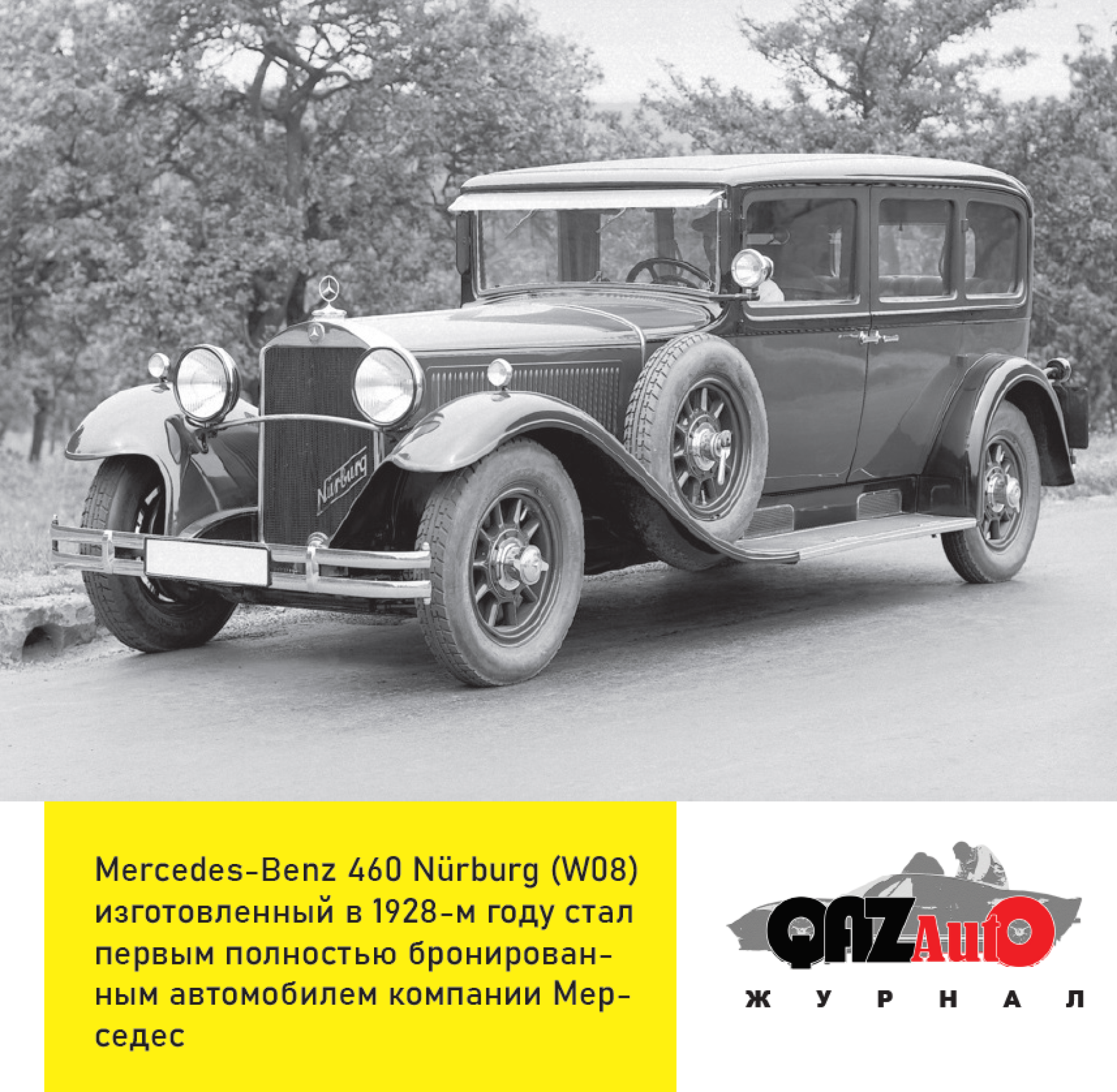 Позднее в Mercedes решили наверстать упущенное и презентовали в 1928 году своё новое творение — Mercedes-Benz 460 Nürburg (W08). Это авто стало первым полностью бронированным экипажем.