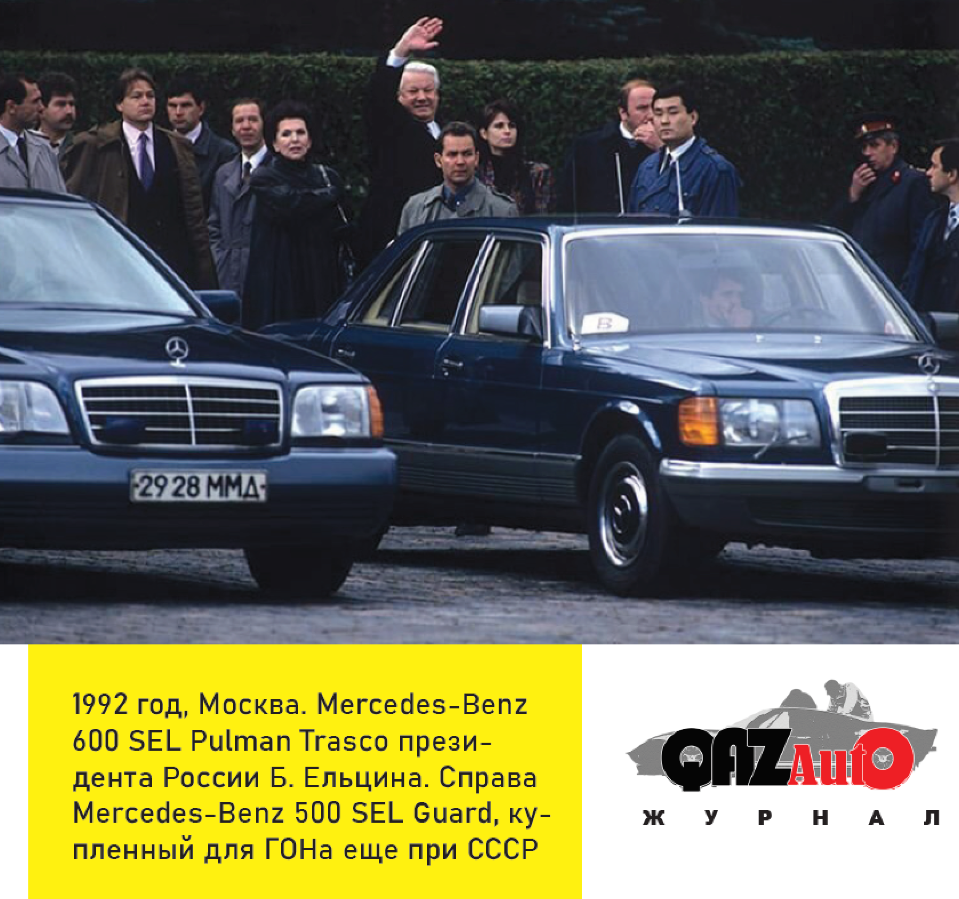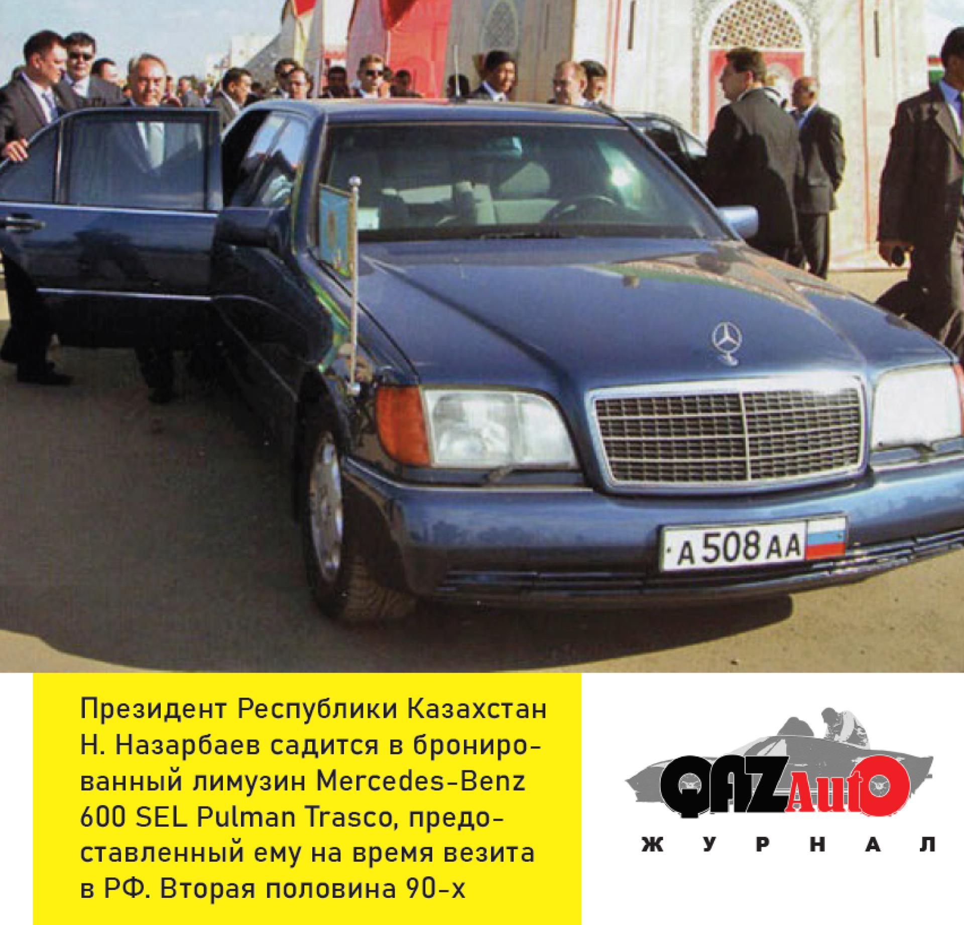 Однако Нурсултану Назарбаеву в те годы приходилось пользоваться услугами не только своего бронированного Mercedes. Среди архивных фотографий удалось найти снимок, на котором он садится в бронированный Mercedes-Benz 600 SEL Pullman Trasco, который был ему предоставлен на время визита в Россию во второй половине 90-х.