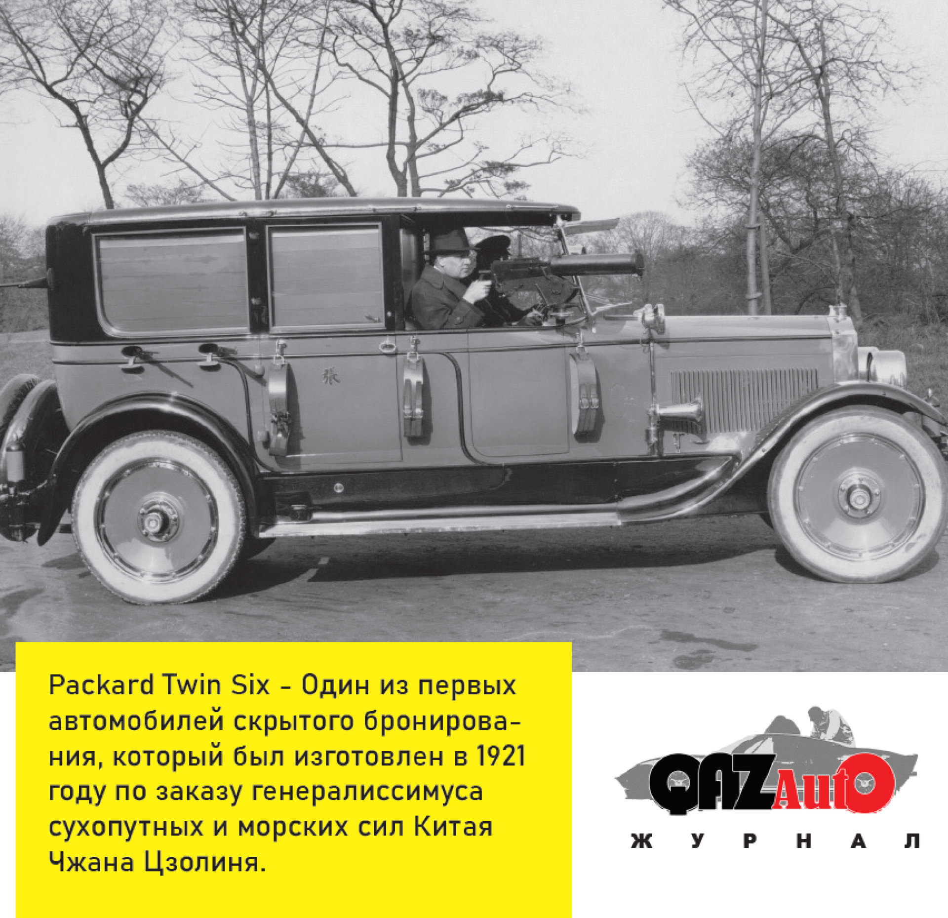 Однако, учитывая, что это было лишь частичное бронирование — по поясничную линию, первым гражданским бронеавтомобилем всё же следует считать Packard Twin Six, который был изготовлен в 1921 году по заказу генералиссимуса сухопутных и морских сил Китая Чжана Цзолиня.